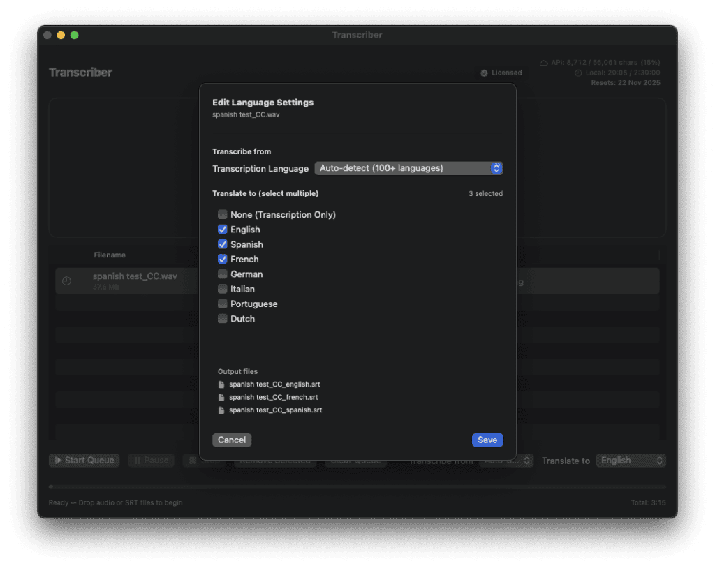 If you already have an SRT file to translate into other languages, e.g. to localise your final edit, you can just drop the srt file into the TT app and it will output your selected translations as multiple SRT files.