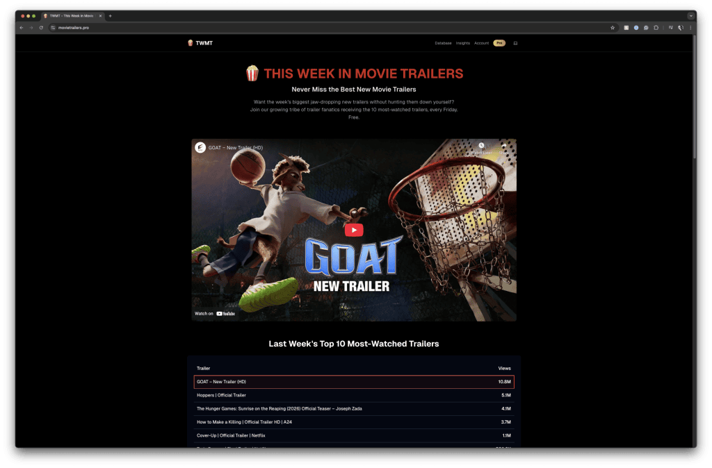 Each week the system finds and adds every new trailer released in that week to a growing database (1000+ in 2025). It then calculates which are the Top 10 most-watched trailers released that week and delivers them to your inbox.